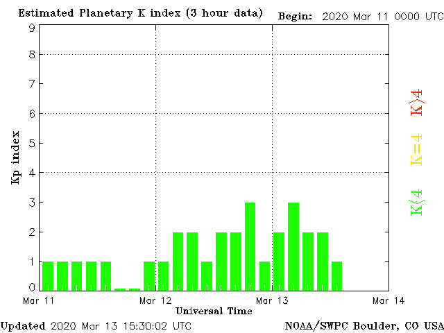 Geomagnetic activity is mostly stable, ranging from 1 to 3 of the Kp Index. The solar wind intensity rose yesterday afternoon but with little impact on the geomagnetic field. The solar wind will be calm throughout the day. No major geomagnetic storms are likely over the next few days.