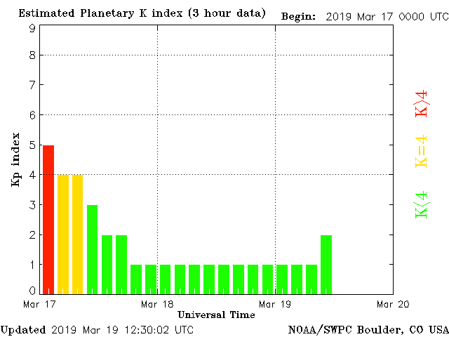 Geomagnetic activity is stable, ranging from 2 to 3 of the Kp Index. The solar wind intensity spiked modestly but will return to normal later today. No major storms expected for the next few days, until the next earth-facing coronal-hole stream impact takes place.