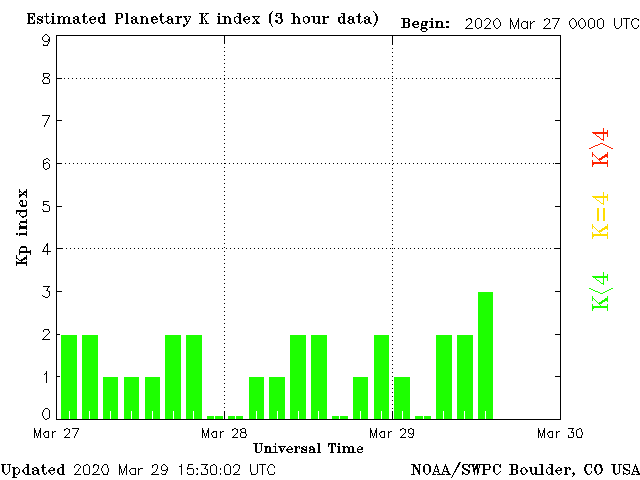 Geomagnetic activity is somewhat stable, ranging from 0 to 3 of the Kp Index. The solar wind intensity is mostly calm. A minor rise phi angle shift of the geomagnetic field caused a minor disturbance this morning. The expected coronal-hole stream is now expected to arrive on the 31st. Calm conditions until then.