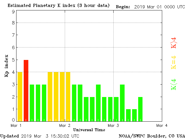 Geomagnetic activity is stabilizing, ranging from 1 to 3 of the Kp Index. The solar wind intensity is still diminishing. No additional storms are expected. The next earth-facing coronal-hole is coming right on the heels of the departing coronal hole. The geomagnetic field should adjust quickly without any major storms.