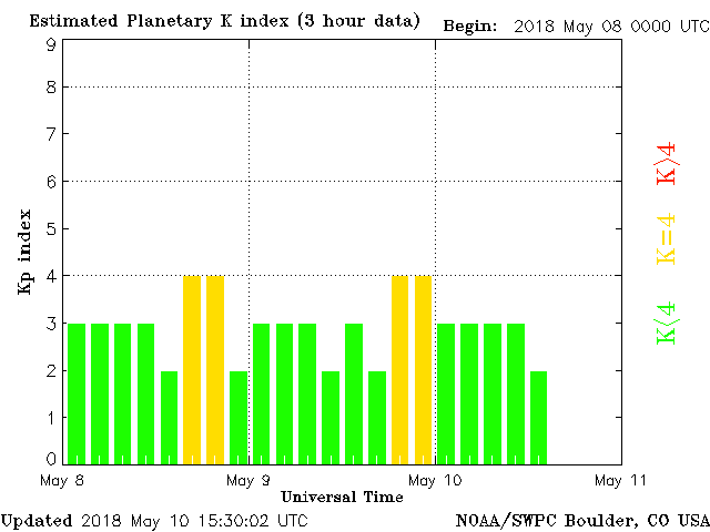 Geomagnetic activity is still stabilizing, ranging from 2 to 3 of the Kp Index. Solar wind intensity continues to slowly decline, with minor geomagnetic upticks occurring as the field stabilizes from the stronger solar wind stream.