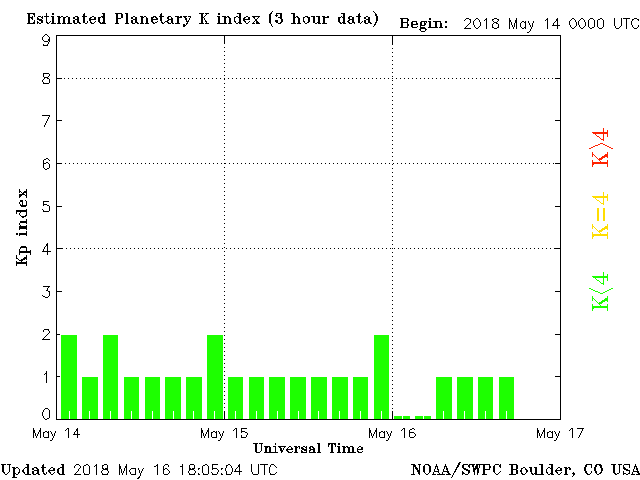 Geomagnetic activity is stable, steady at 0 to 1 of the Kp Index. Solar wind intensity is calm. The next earth facing coronal hole is quite large and will begin interacting with the earth in a day or so.