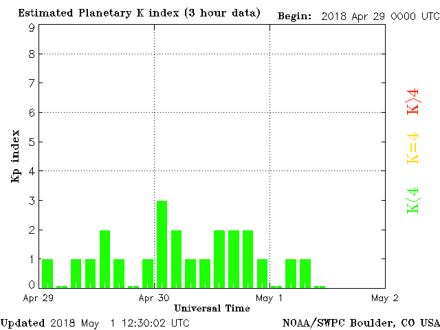 Geomagnetic activity is stable, ranging from 0 to 1 of the Kp Index. Solar wind intensity is reducing and the geomagnetic field will be stable for at least two days before the next incoming coronal hole stream.