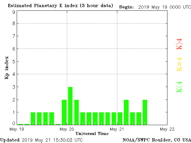Geomagnetic activity is stable, ranging from 0 to 1 of the Kp Index. The solar wind intensity is erratic but within normal conditions. No major storms are expected but spikes could occur.
