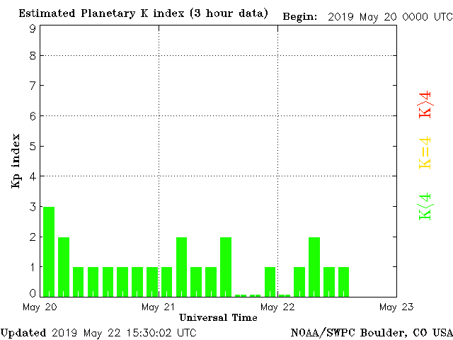 Geomagnetic activity is stable, ranging from 0 to 1 of the Kp Index. The solar wind intensity has returned to quiet conditions. The next earth-facing coronal-hole stream should interact with the earth in several days.