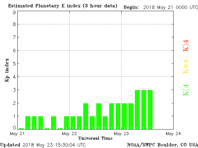 Geomagnetic activity is somewhat unstable, ranging from 2 to 3 of the Kp Index. Solar wind intensity is increased due to the earth-facing coronal hole and solar flare activity from yesterday. Conditions will likely stabilize throughout the day, with possible spikes in geomagnetic activity.