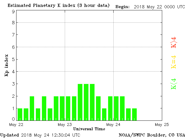 Geomagnetic activity is stabilizing, ranging from 1 to 2 of the Kp Index. Solar wind intensity is calming. Conditions will likely stabilize throughout the day, with possible spikes in geomagnetic activity.
