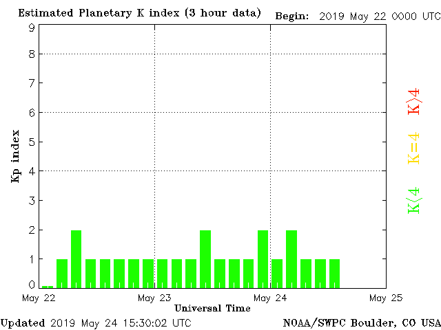 Geomagnetic activity is stable, ranging from 1 to 2 of the Kp Index. The solar wind intensity is calm. The next earth-facing coronal-hole stream is weak and should interact with the earth in several days.