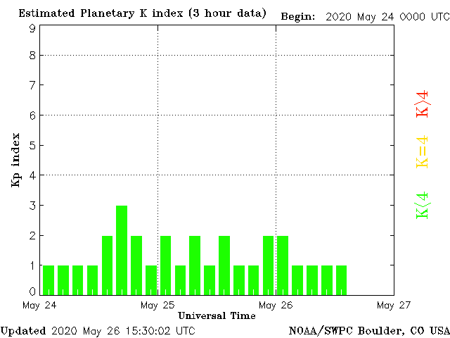 Geomagnetic activity is fairly stable, ranging from 1 to 2 of the Kp Index. The solar wind intensity is calm despite a very minor impact from a solar wind stream. No major coronal-hole streams expected.