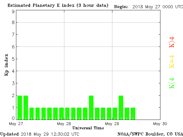 Geomagnetic activity is stable, ranging from 1 to 2 of the Kp Index. Solar wind intensity is calming. Minor solar flare rippled across the earth-facing disk yesterday. No major upticks in geomagnetic activity expected.
