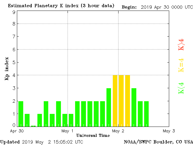 Geomagnetic activity is somewhat unstable, ranging from 2 to 4 of the Kp Index. The solar wind intensity is rose last night due to the expected coronal-hole stream, causing a minor geomagnetic uptick. No major storms are expected.