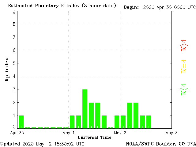 Geomagnetic activity is stabilizing, ranging from 1 to 2 of the Kp Index. The solar wind intensity is fairly calm. Another minor geomagnetic disturbance took place earlier today, as a result of a solar wind speed spike. But the density of the solar wind weakened in concordance with the rise in speed, resulting in a minor disturbance of the geomagnetic field. The next minor uptick in solar wind stream intensity should arrive on the 3rd, with another uptick possibly arriving on the 6th.