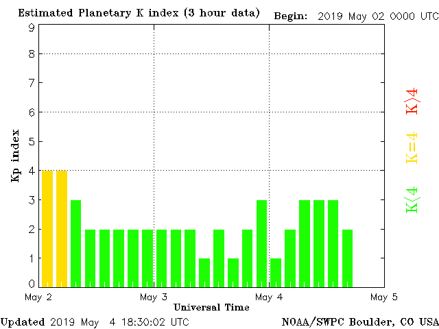 Geomagnetic activity is somewhat unstable, ranging from 2 to 4 of the Kp Index. The solar wind intensity is slowly returning to normal. No major storms are expected.