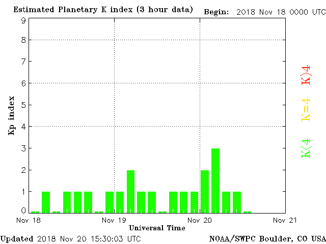 Geomagnetic activity is somewhat unstable, ranging from 0 to 3 of the Kp Index. Solar wind intensity spiked modestly, but with little impact to the geomagnetic field. The next earth-facing coronal hole will interact with the earth in several days.
