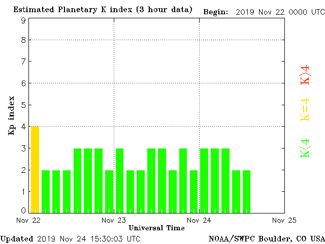 Geomagnetic activity is somewhat unstable, ranging from 2 to 3 of the Kp Index. The solar wind intensity is slowly declining. The next earth-facing coronal-hole stream will impact on the 27th or so.