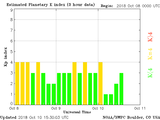 Geomagnetic activity is stabilizing, ranging from 1 to 3 of the Kp Index. The solar wind is calming. The next earth-facing coronal hole stream is expected to impact in several days.