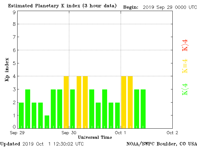 Geomagnetic activity is stabilizing, ranging from 3 to 4 of the Kp Index. The speed and density continue to drop. Conditions are expected to remain calm for the next few days, with minor upticks possible due to shifting geomagnetic field states.