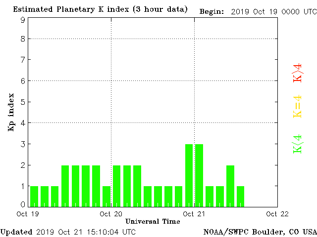 Geomagnetic activity is stable, ranging from 1 to 3 of the Kp Index. The speed and density of the solar wind is low in intensity. The expected coronal-hole stream arrived but impacted without causing major geomagnetic upticks. The next major solar-wind stream is likely to hit earth on the 26th or so.