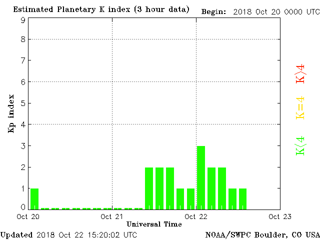 Geomagnetic activity is stable, ranging from 1 to 3 of the Kp Index. The solar wind is somewhat unstable due to a phi angle shift. The next coronal hole stream should be strong and impact in 24 hours.