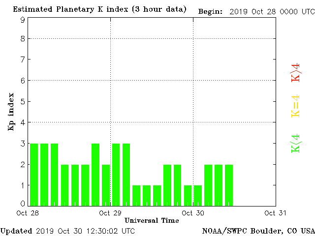 Geomagnetic activity is stabilizing, ranging from 1 to 2 of the Kp Index. The speed of the solar wind is trending down while density is picking up. Calm conditions are expected for the next few days as the solar wind stream normalizes.