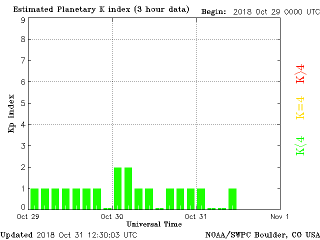 Geomagnetic activity is stable, ranging from 0 to 1 of the Kp Index. The solar wind intensity spiked as expected, but with little to no effect on the geomagnetic field. After this incoming stream, the next coronal-hole stream is expected to interact with the earth in 48 hours or so.