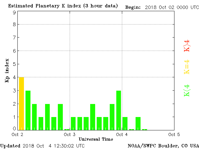 Geomagnetic activity is stabilizing, ranging from 0 to 1 of the Kp Index. The solar wind is calming but erratic. The next earth-facing coronal hole stream is expected to impact in several days, with large impact. Calm conditions expected in the meantime.