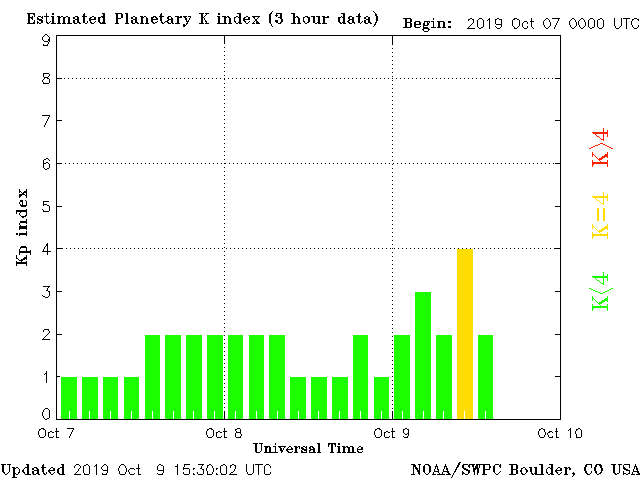 Geomagnetic activity is stable, ranging from 2 to 4 of the Kp Index. The speed and density of the solar wind is calm. A minor spike in the geomagnetic field occurred due to a phi angle shift. Calm conditions expected for the next few days.