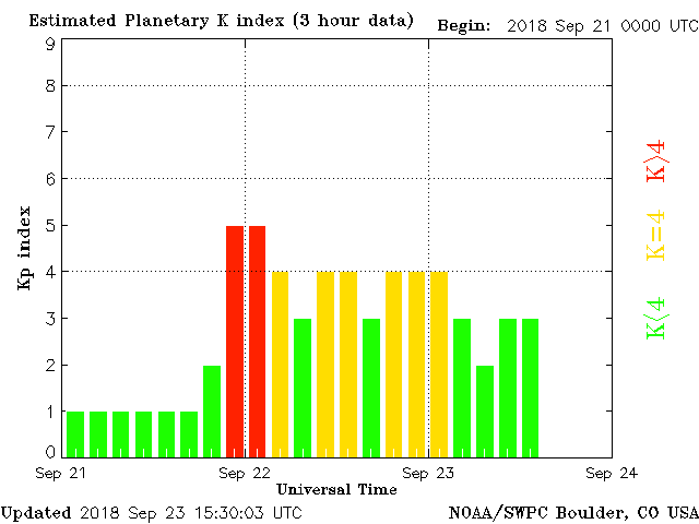 Geomagnetic activity is somewhat unstable, ranging from 2 to 3 of the Kp Index. The solar wind speed already started to diminish. Geomagnetic conditions are expected to continue to calm throughout the day with minor upticks possible.