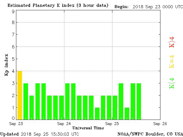 Geomagnetic activity is stabilizing, ranging from 1 to 3 of the Kp Index. The solar wind speed continues to diminish. Geomagnetic conditions are expected to continue to calm throughout the day with minor upticks possible.