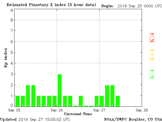 Geomagnetic activity is stable for now, ranging from 1 to 2 of the Kp Index. The speed and density beginning to rise, as expected, dued to the solar wind impact. The solar wind is expected to increase in intensity over the next 2 days, likely resulting in geomagnetic disturbances. Erratic conditions for the next few days.