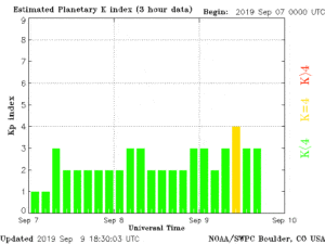 Geomagnetic activity is somewhat unstable, ranging from 3 to 4 of the Kp Index. The speed and density of the solar wind rose briefly, causing a minor geomagnetic disturbance. A spike in solar wind density is expected over the next 2 days, corresponding with a drop in speed. This means no major geomagnetic upticks are expected.