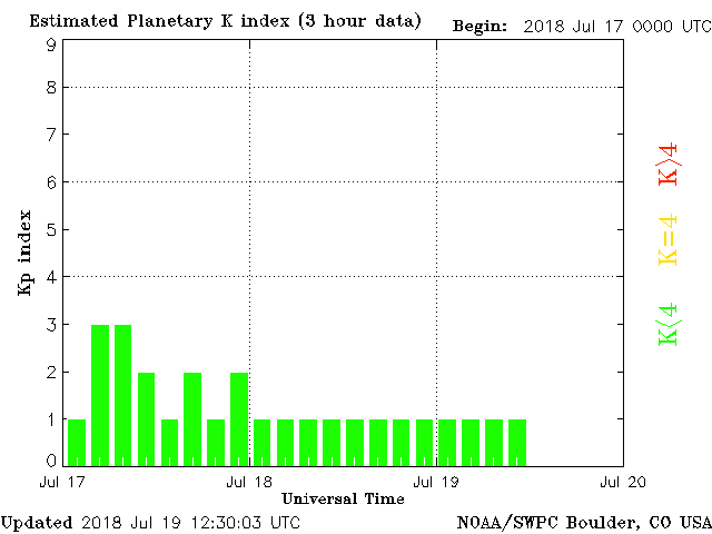Geomagnetic activity is stable for the time being, steady at 1 of the Kp Index. Solar wind intensity is intensifying as the coronal-hole stream impacts the earth. There is a chance of geomagnetic uptick as the solar wind intensifies throughout the next day. A second coronal-hole is right behind the departing one, which could cause minor geomagnetic storms over the next two days.