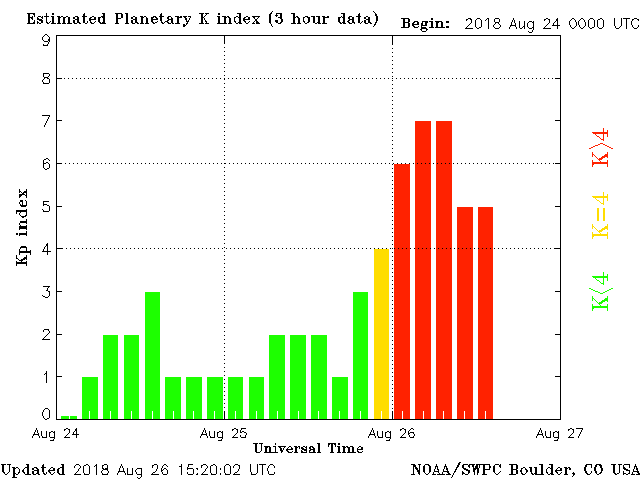 Geomagnetic activity is unstable, ranging from 5 to 7 of the Kp Index. Solar wind intensity remains lowt. Geomagnetic storms resulted from a phi angle shift in the geomagnetic field, coupled with a magnetic connection to the sun that resulted in a rather large plasma penetration event. These conditions are expected to calm and return to normal throughout the day. Stormy activity will likely last for the next 12 hours or so.