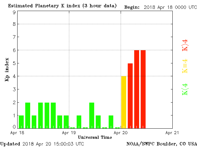 Geomagnetic activity is unstable, ranging from 5 to 6 of the Kp Index. Solar wind intensity spiked sharply early this morning resulting in comparatively intense geomagnetic storms, a level event. This activity should persist for a least the rest of the day.