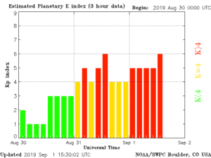 Geomagnetic activity is unstable, ranging from 5 to 6 of the Kp Index. The speed of the solar wind peaked earlier today, expected to remain strong until the 3rd. Level 2 geomagnetic storms (kp 6 or greater) took place in the past 24 hours. Conditions should begin to calm later today, likely after a secondary uptick of activity. The next high speed solar wind stream will move into earth-facing direction in a week or so.