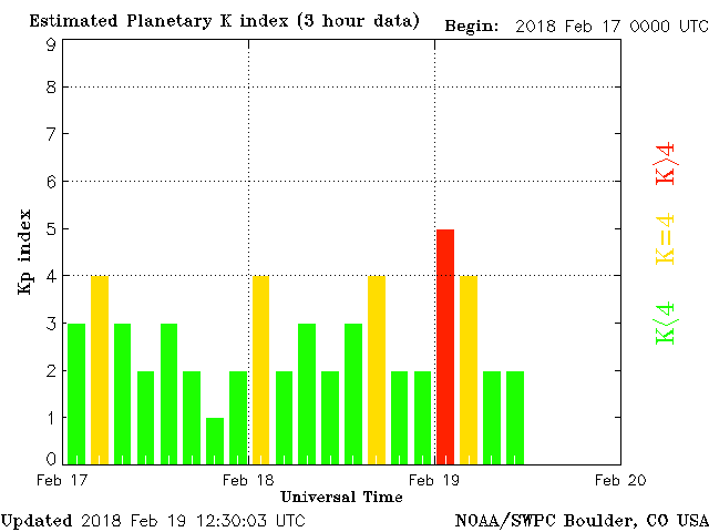 Geomagnetic conditions are unstable, ranging from 2 to 4 of the KP index. A geomagnetic storm occurred this morning, due to a solar wind intensification spike. These conditions will persist for the rest of the day.