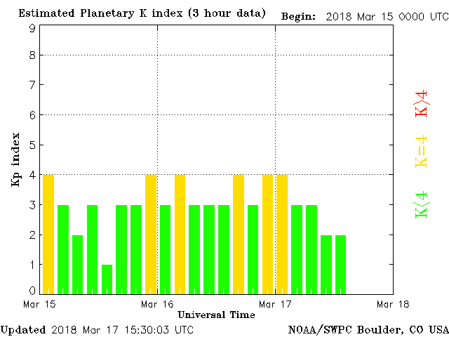 Side note: According to Ben Davidson, of Suspicious0bservers, during the equinoxes (spring and fall) the tilt angle of the earth with respect to the sun increases the intensity of geomagnetic storms, which explains why the rather mild solar wind intrusion a few days ago caused a prolonged period of instability, lasting about tw0 days.