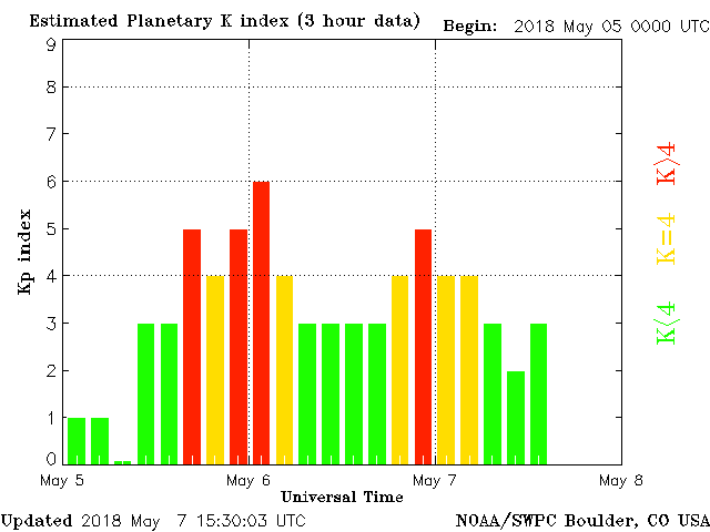 Geomagnetic activity is stabilizing, ranging from 2 to 4 of the Kp Index. Solar wind intensity is still rather strong, although the geomagnetic field has began to adjust to the increased energy. Conditions should continue to stabilize as the earth-facing coronal hole departs.