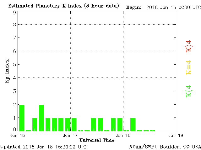 Geomagnetic conditions are very stable, ranging from 0 to 1 of the KP index. The next earth-facing coronal hole stream is expected to impact in several days, around Friday evening or Saturday morning, depending on solar wind speed.
