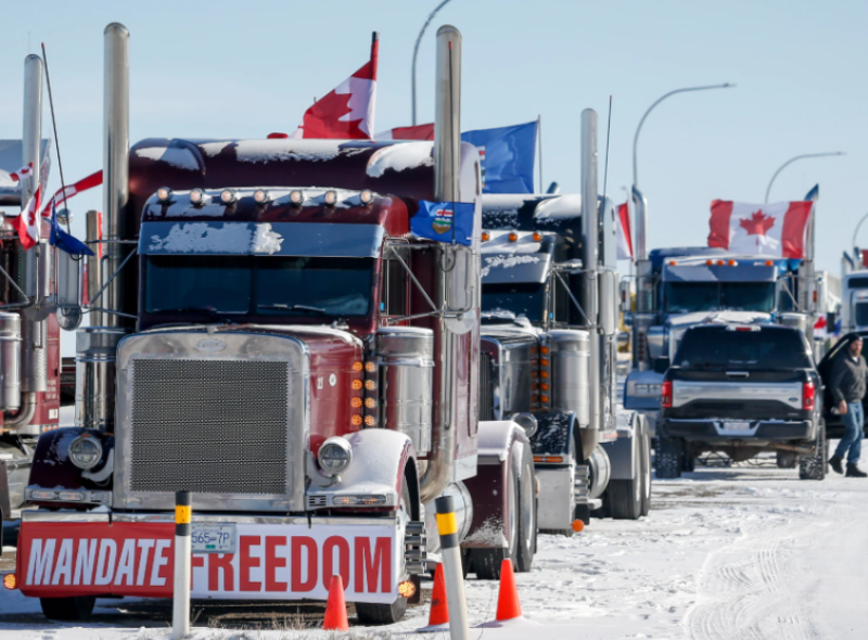 The massive, peaceful convoy traveled across Canada to the nation’s capital last weekend for a pro-freedom rally. Prime Minister Justin Trudeau, who was hiding under his bed after being exposed to COVID, called the huge group a “small fringe minority.” On Monday, the truckers headed to the Alberta-US border, where they are currently parked.