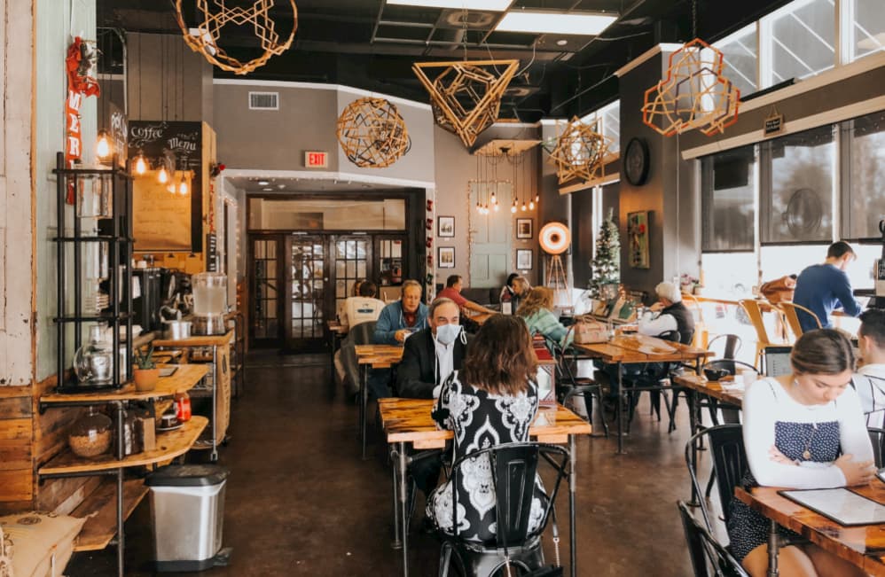 While the chain coffee shops like Starbucks and Dunkin’ are closed to indoor patrons, my favorite local coffeeshop is open and more popular than ever. (And why buy overpriced, mediocre chain coffee anyway?) Looking around, I only see one customer wearing a mask, and only one of the baristas.