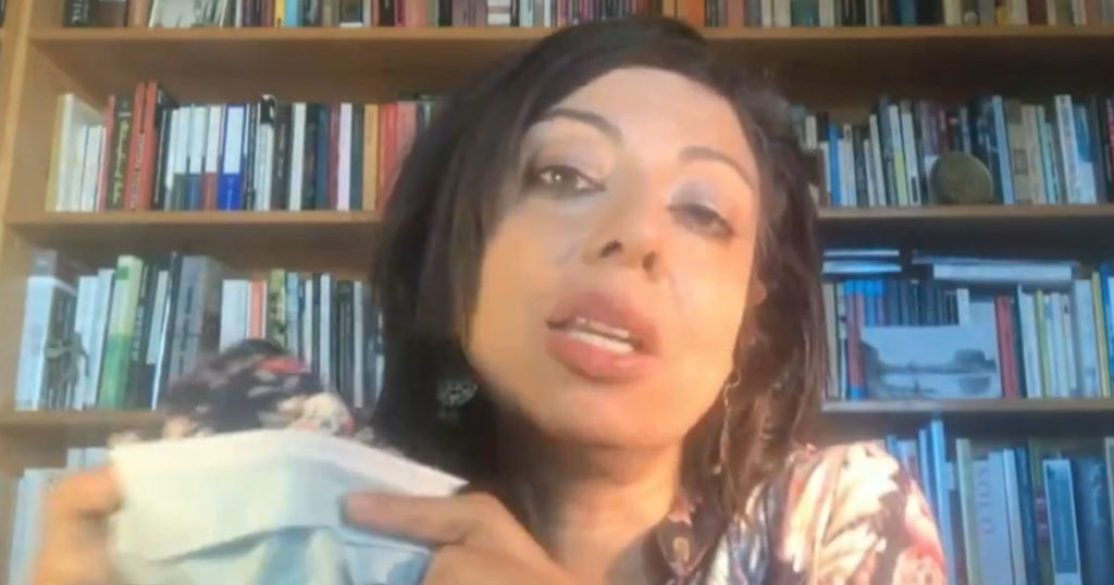 An infectious disease expert then explains that the “electrostatic repulsion” and “then like, different fibers going different ways” make double masking even better than single masking.