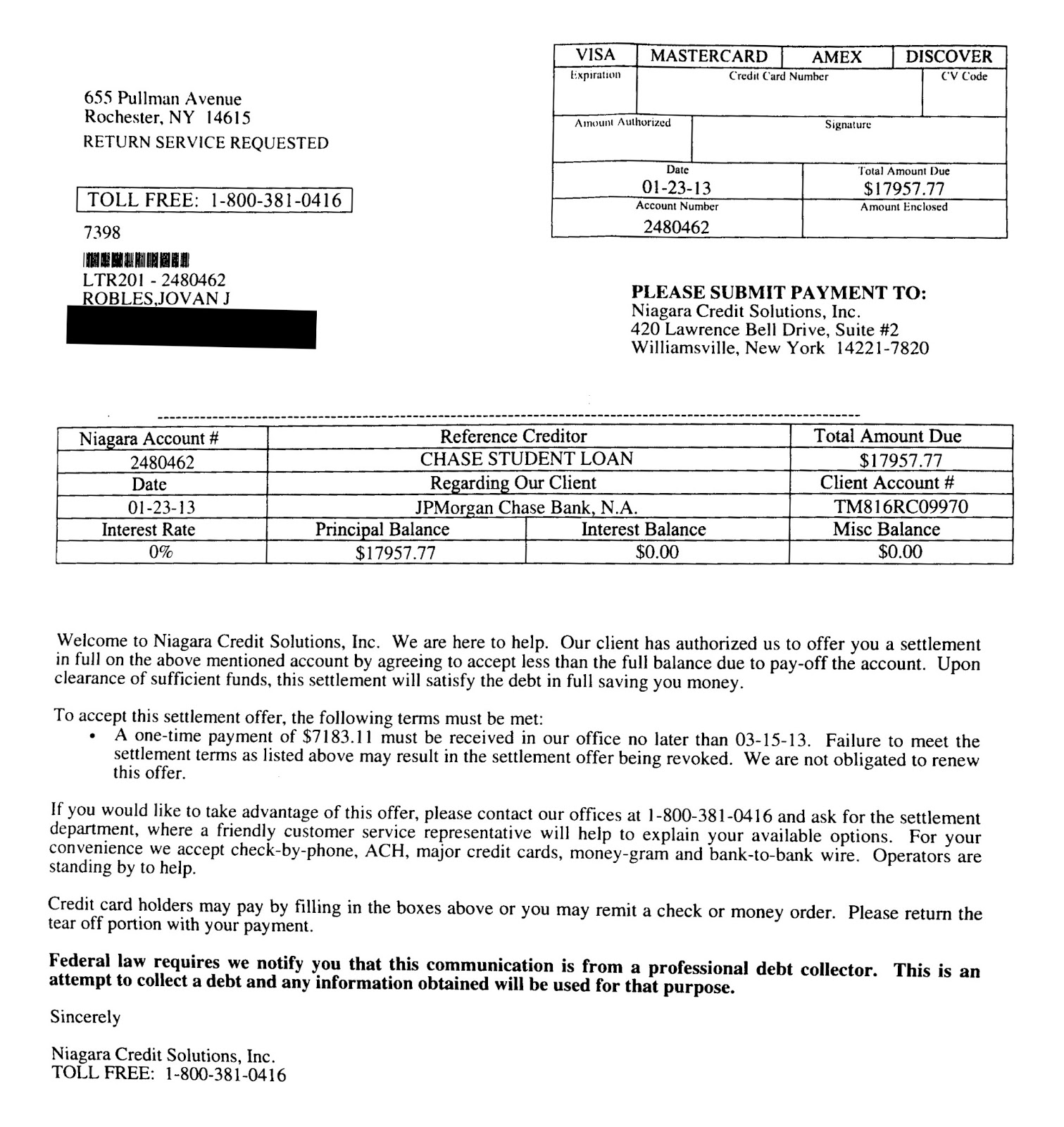 I received this attempt to collect a debt from a previously foreclosed entity (NIAGARA). A Courtesy Notice was sent to the CEO of Niagara Credit Solutions and no response was ever received. I called Niagara and they informed me they had retracted their stance and had “given” the debt back to Chase. In other words Niagara Credit Solutions, Inc., upon the receipt of my Courtesy Notice, decided they did not want to contract with me and walked away.