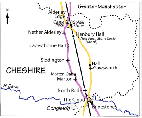 Figure 2: The three aspects of a ley line: The straight black line marks the alignment, the