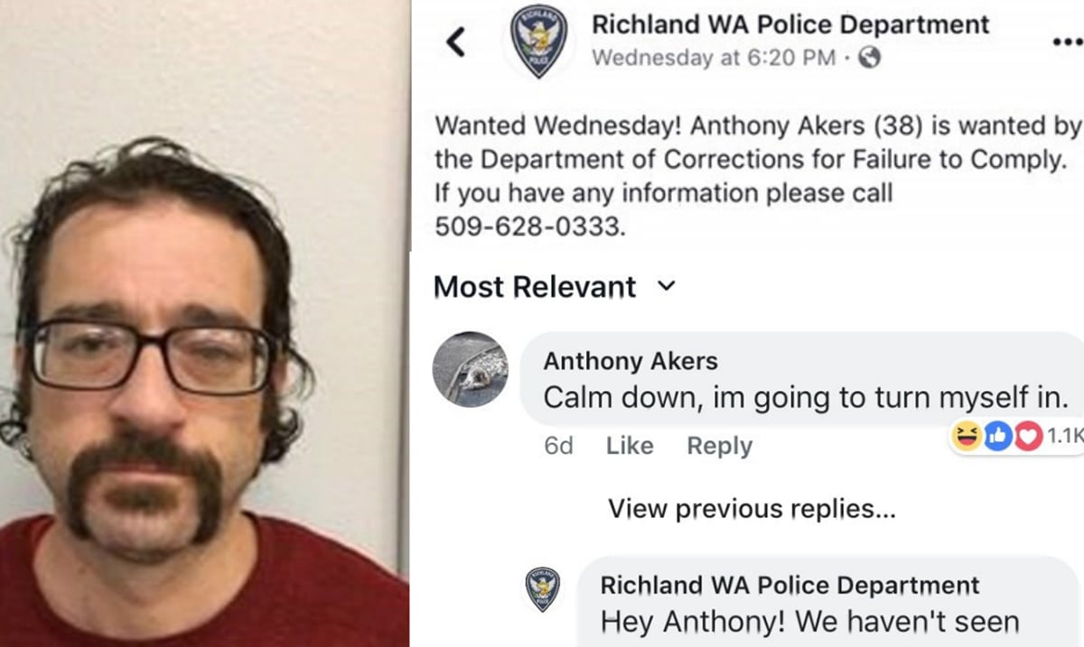 On November 28th, department officials took to the Facebook page for what they referred to as ‘Wanted Wednesday’, sharing the following: “Wanted Wednesday! Anthony Akers (38) is wanted by the Department of Corrections for Failure to Comply. If you have any information please call 509-628-0333”