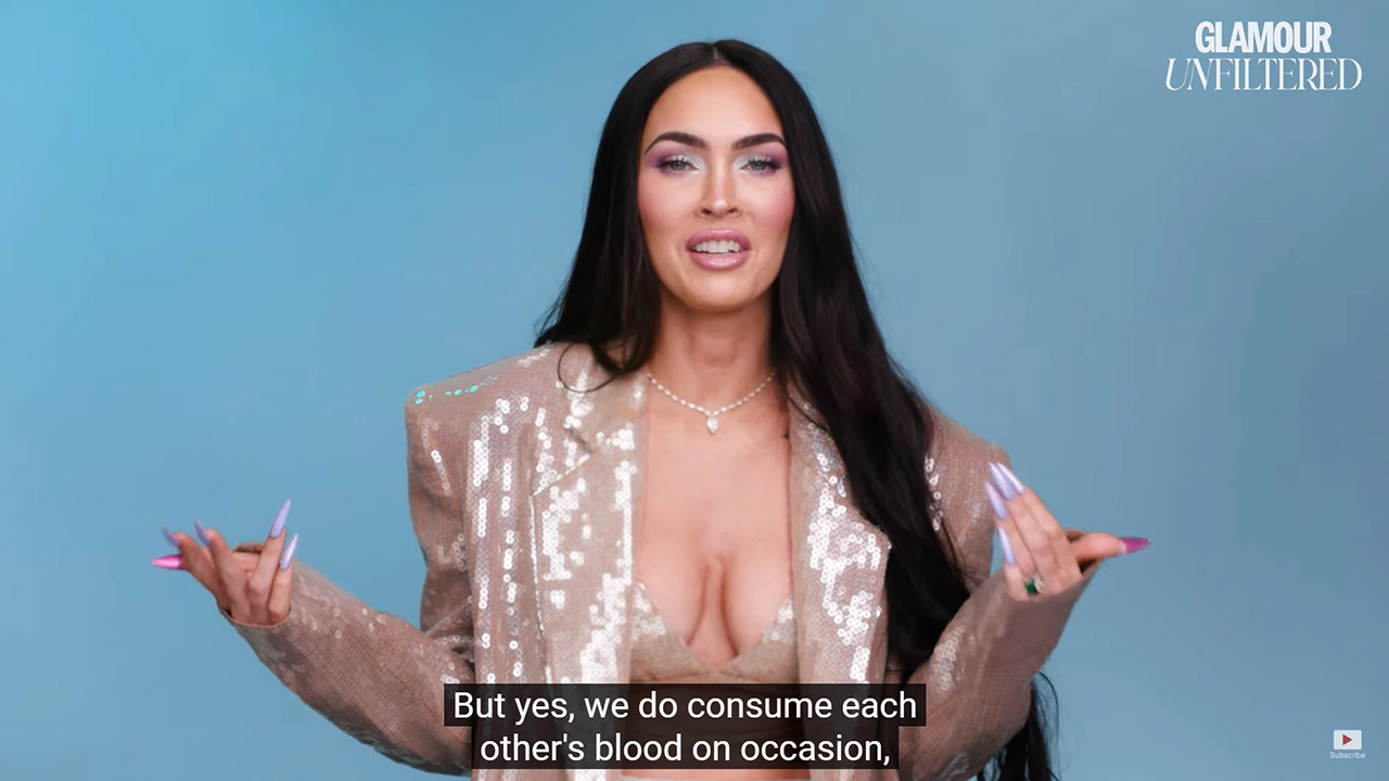 In the Glamour interview, Megan Fox’s blood ritual revelations were preceded and followed by a whole lot of Hollywood virtual signaling. Indeed, Fox began by talking about how she was a “feminist icon who fought the patriarchy” and so forth. This generic blabbering set the table for her casually talking about literally DRINKING BLOOD as if it was not COMPLETELY INSANE.