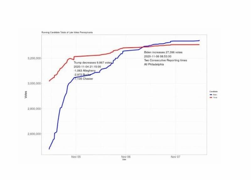 All goes well for Trump until 2020-11-04 21:15:00 when he loses just under 10,000 votes, but curiously from three different counties simultaneously: -1,063 Allegheny; -2,972 Bucks; -7,135 Chester. Biden never lost any votes (at least, in this late voting).