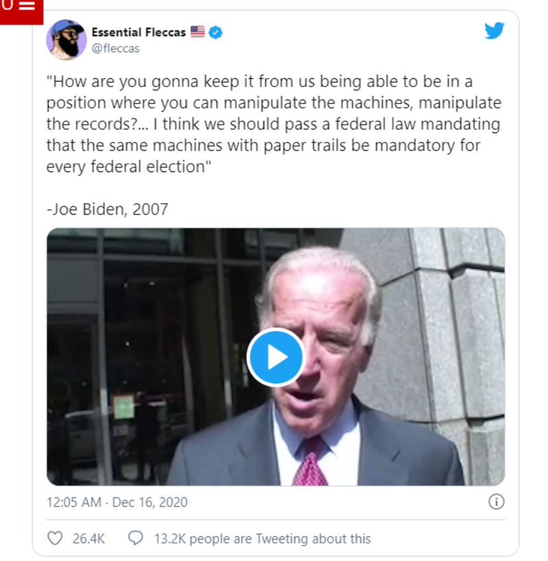 Joe Biden believed back then that elections could be stolen with electronic voting machines. But as evidence of voting irregularities in the 2020 election mounts, we’re being sold the idea that everything was above board. “We the people voted. Faith in our institutions held,” Joe Biden declared after the official voting of the Electoral College. “The integrity of our elections remains intact.”
