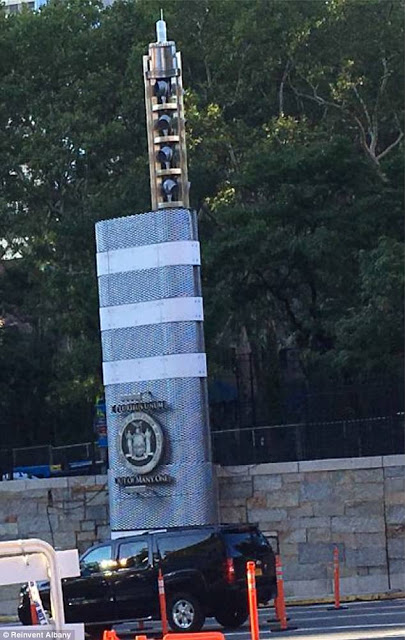 Shams Tarek, a spokesman for the MTA, told Politico that the towers ‘host cameras, traffic monitoring and other equipment related to homeland security that would otherwise have been hosted by the former toll booth structures’.