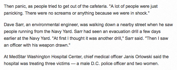 From USA Today, 9/16: Dave Sarr, an environmental engineer, was walking down a nearby street when he saw people running from the Navy Yard. Sarr had seen an evacuation drill a few days earlier at the Navy Yard. “At first I thought it was another drill,” Sarr said. “Then I saw an officer with his weapon drawn.”